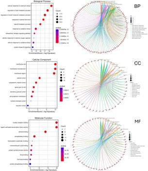 GO includes three parts: Molecular Function (MF), Biological Process (BP), and Cellular Component (CC), and the GO functional annotations include 1862 BP, 80 CC, and 197 MF. During the analysis, the entries of BP, CC, and MF categories were sorted based on the adjusted P-value and target count (Count value), and the top 10 entries in each category were selected. Using these data, bubble plots were constructed to visualize the results, in which the size of the bubbles reflected the concentration trend of the targets, and the shade of the colours (usually red indicates higher significance) was inversely proportional to the corrected P-value, i.e., brighter colours indicated more significant significance. The BP primarily involves the cellular response to chemical stress, regulation of lipid metabolic processes, regulation of small molecule metabolic processes, response to steroid hormones, and response to steroid metabolic processes, among others. MF mainly focuses on nuclear receptor activity, ligand-activated transcription factor activity, steroid binding, phosphatase binding, transcription coactivator binding, etc., and CC mainly focuses on functional positions such as membrane raft, membrane microdomain, membrane region, vesicle lumen, cytoplasmic vesicle lumen, etc. (Figure 1).