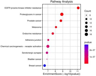 There were 138 pathways in KEGG pathway enrichment analysis. According to the sorting of corrected P-value and Count value, 10 pathways with significant differences were selected and bubble plots were made for visualization, mainly EGFR tyrosine kinase inhibitor resistance, Proteoglycans in cancer, Prostate cancer, Melanoma, Endocrine resistance and other signaling pathways. This result suggests that C. Moutan compounds can work together to produce a therapeutic effect on therapeutically effect diabetes by modulating different biological pathways (Figure 2).