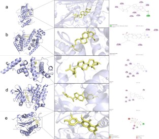 Based on the results of GO and KEGG analyses, AKT1, PPARG, EGFR, SRC & CASP3 were selected as targets for molecular docking in this study (Figure 5). The results showed that the free energy of binding of AKTI to sitosterol ligand was -11.0 Kcal/mol, the free energy of binding of PPARG to Mairin ligand was -8.7 Kcal/ mol, the free energy of binding of EGFR to sitosterol ligand was