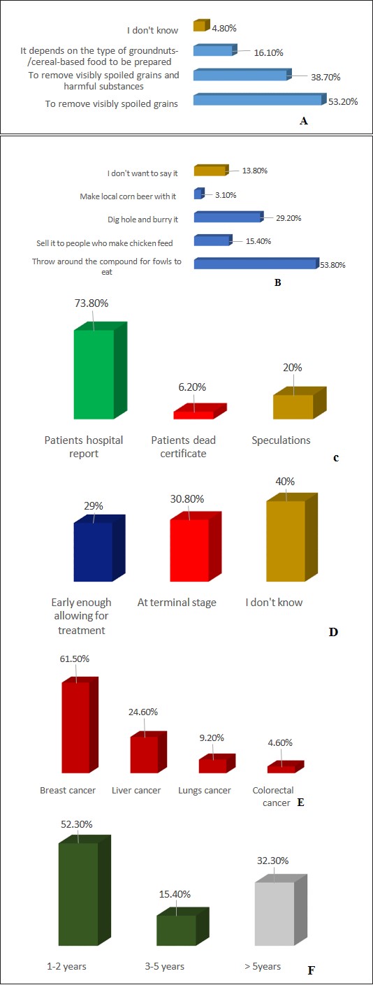 Over 89% of the studied participants revealed that a variety of food products were being manipulated for economic gains (Figure 1). While 53% of respondents revealed they hand sorted visibly spoiled grains and washed grains before processing, 38.7% of them were aware that such a step also removed harmful substances (food contaminants) (Figure 2a). In view of disposal of visibly spoiled grains, although an estimated 14% reserved their opinions; approximately 54% of respondents stated that they usually throw visibly spoiled grains around their homes for uncaged birds to feed on; 29% did landfill; 15% sold visibly spoiled grains to be included in caged birds feed processing; and 3% used visibly spoiled grains to prepare corn beer locally for human consumption (Figure 2b). Based on cancer victims’ hospital reports (73.8%), death reports (6.2%) and speculations (20%) (Figure 2c), participants revealed awareness of cases of diet-related cancer with breast cancer (61.5%) followed by liver cancer (24.6%) as the most cited (Figure 2d). Generally, an estimated 31% of cancer cases were diagnosed at the terminal stage, with 29% diagnosed early enough and allowed for treatment (Figure 2e). From diagnosis to death, a majority (52%) of cancer victims lived for up to 2 years, with an estimated 32% that lived for up to 5 years (Figure 2f).
